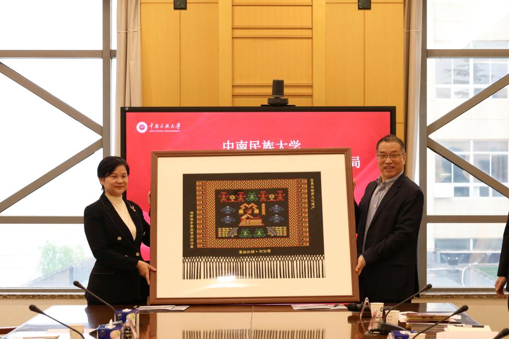 会前,林洪冰代表保亭黎族苗族自治县向必赢官网赠送了中华民族大团结海南黎锦画。
