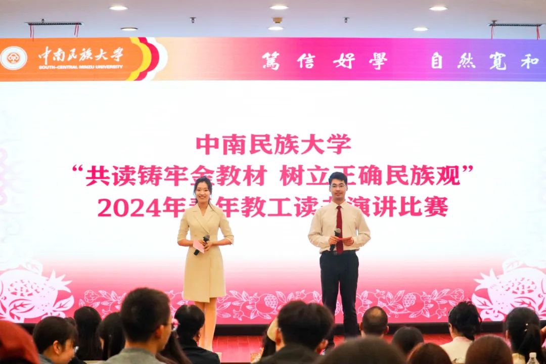 4月11日,“共读铸牢金教材,树立正确民族观”2024年青年教工读书演讲比赛在学术交流中心举行。来自13个单位的15位青年教师围绕《中华民族共同体概论》教材分享心得感悟。湖北省演讲协会副会长陈飞,国家三级导演何苗,校团委、党委教师工作部、工会、中华民族共同体学院、马克思主义学院相关老师担任本次比赛评委。校党委常委、副校长李红燕出席并讲话。
